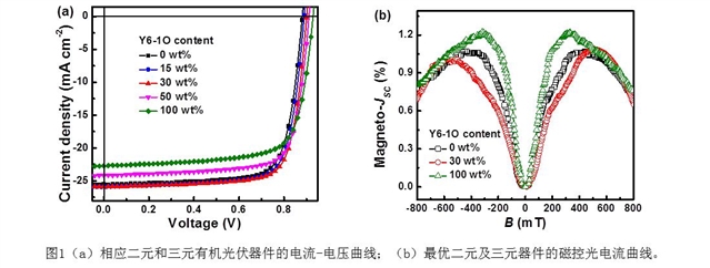 近期,张福俊教授课题组基于兼容性较好的高效非富勒烯材料Y6及其衍生物Y6-1O为受体,宽带隙聚合物材料D18-Cl为给体,制备出效率为17.9%的三元有机光伏器件。该值是有机光伏器件最高效率之一。在该工作中,磁控光电流的方法被首次引入至三元体系,据此得出三元器件内电荷分离更加有效的结论,这为分析三元器件性能的提升提供了更为坚实的证据。该工作以“Approaching 18% efficiency of ternary organic photovoltaics with wide bandgap polymer donor and well compatible Y6:Y6-1O as acceptor”为题,发表在National Science Review上。